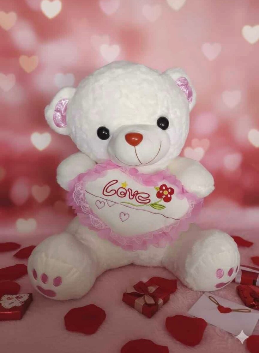 Un adorable nounours en peluche blanc tenant un coeur rose avec le mot 'Love'. Idéal pour la Saint-Valentin ou comme cadeau pour les personnes aimées. En peluche douce et confortable.