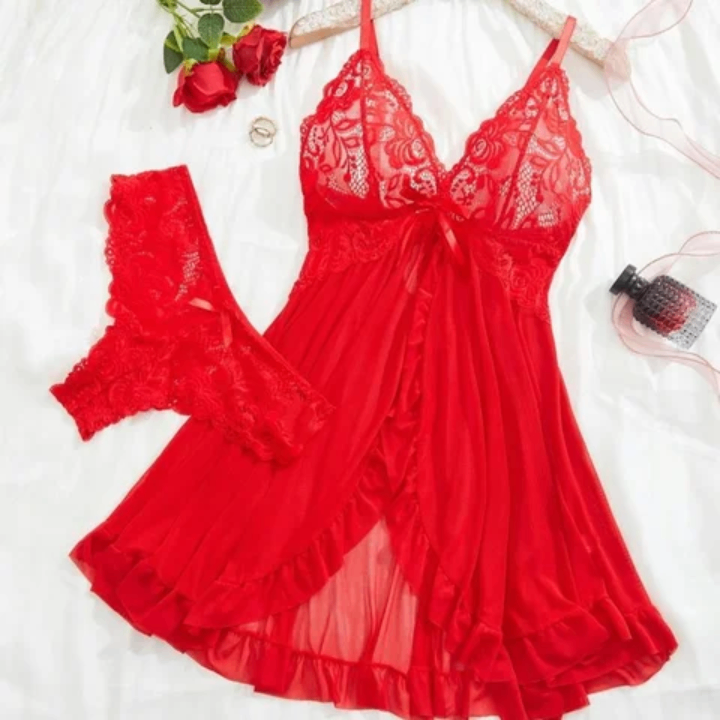 Nuisette en dentelle élégante avec culotte assortie, parfaite pour un look séduisant et confortable. Idéal pour les occasions spéciales et les moments intimes.