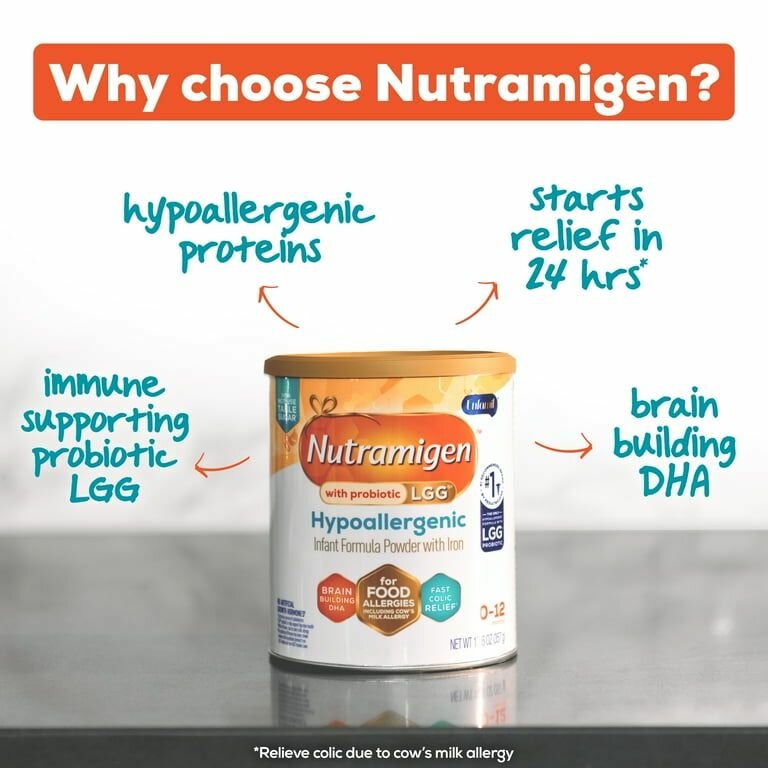 If your baby has an allergy to the cow's milk protein, Nutramigen has LGG probiotic & extensively hydrolyzed protein to provide colic relief starting as early as from the first feeding