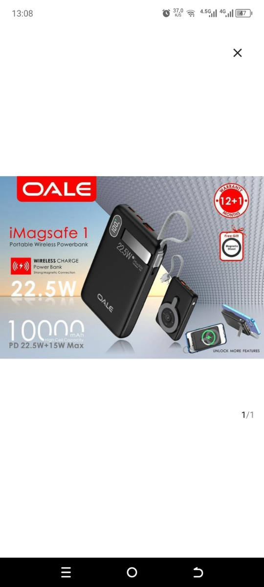 Chargeur portable sans fil OALE iMagsafe 1, capacité 10000mAh, puissance 22.5W. Idéal pour une recharge rapide et pratique.
