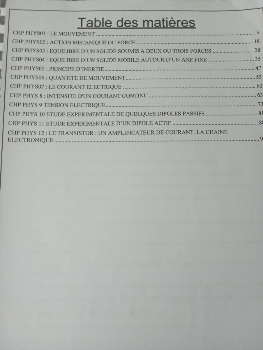 Plan détaillé des chapitres de physique, couvrant le mouvement, la dynamique, l'électricité, et les applications électroniques. Idéal pour les étudiants en sciences.