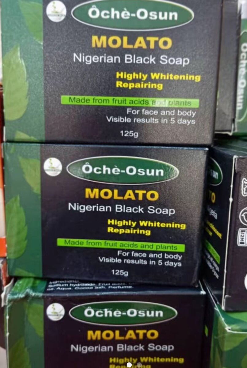 Experience radiant skin with Ochè-Osun Molato Nigerian Black Soap. Formulated with fruit acids and plants, it offers whitening and repairing benefits. Ideal for face and body, see visible results in just 5 days!