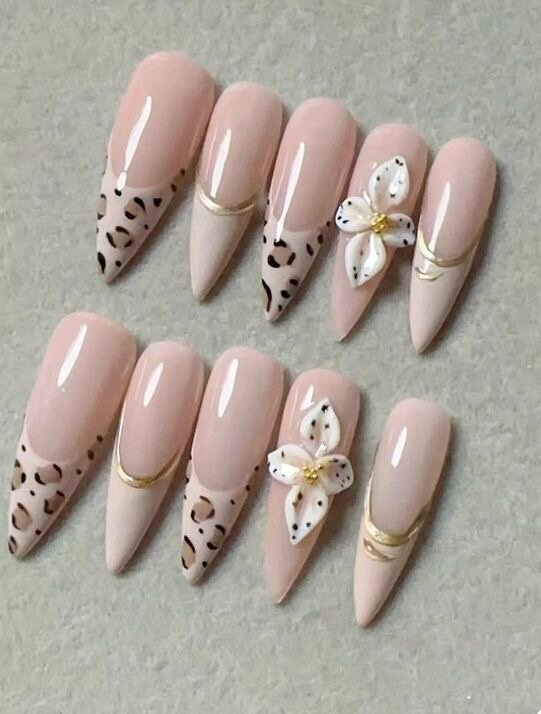 Élégants ongles en acrylique avec motifs floraux et détails léopard. Idéaux pour ajouter une touche glamour à votre style. Parfaits pour occasions spéciales ou usage quotidien raffiné.