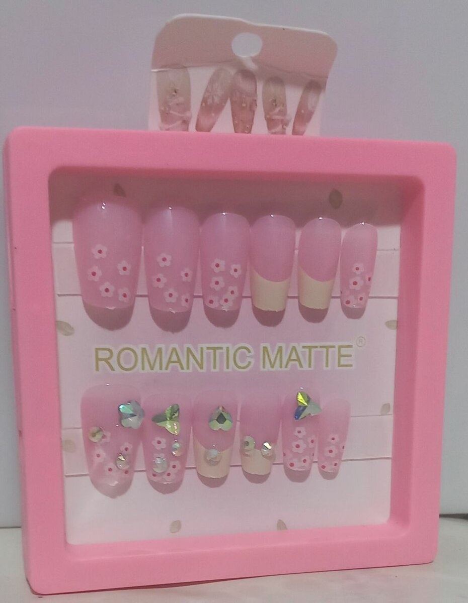 Élégants ongles pressés roses avec motifs floraux et accents brillants. Parfaits pour des occasions spéciales ou un look quotidien sophistiqué. Profitez d'un style romantique et soigné sans effort.