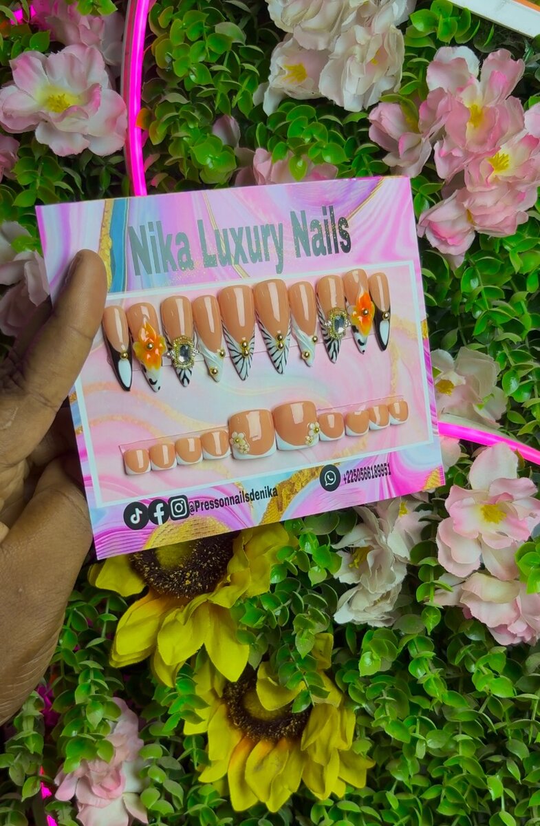 Découvrez nos ongles press-on luxueux, parfaits pour une manucure instantanée et élégante. Décorés de motifs uniques et de bijoux étincelants, ces ongles sont idéaux pour toute occasion, que ce soit une fête ou un événement spécial. Faciles à appliquer et conçus pour durer, ils vous offriront un style sans effort. Apportez une touche de glamour à votre look avec notre collection exclusive.