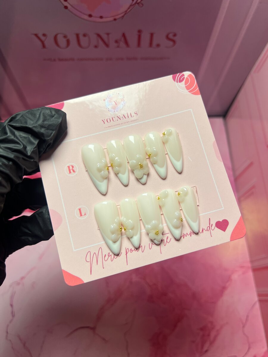 Ongles press-ons ivoire avec détails dorés, parfaits pour un look raffiné chaque jour. Faciles à appliquer et confortables, idéals pour des événements spéciaux ou pour ajouter une touche de sophistication à votre quotidien.