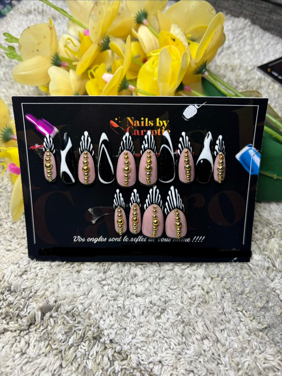 Transformez vos ongles avec ces press-ons élégants, ornés de détails dorés. Parfaits pour une soirée ou un événement spécial. Faciles à appliquer, ils offrent un look professionnel sans salon. Faites briller vos mains !