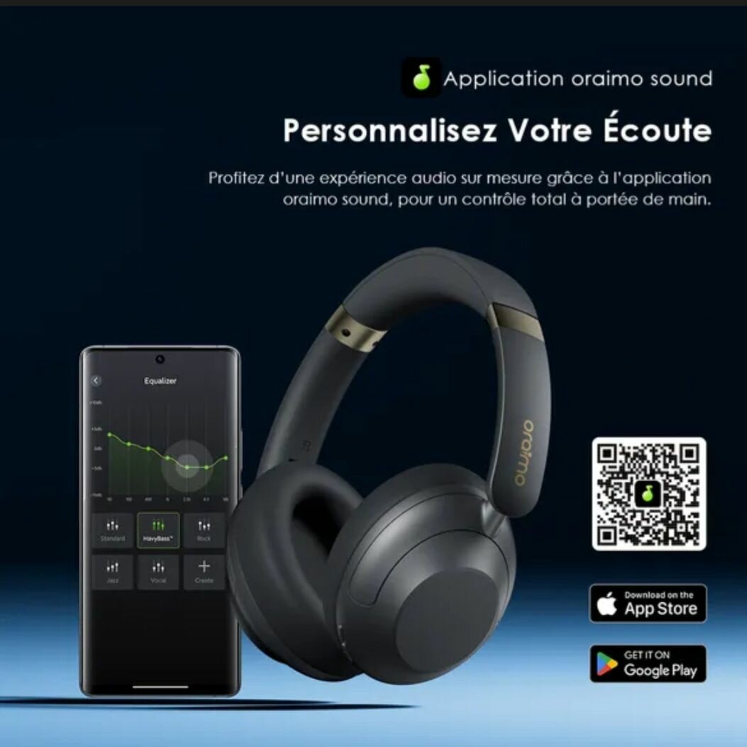 Découvrez le casque Bluetooth oraimo pour une expérience sonore exceptionnelle. Profitez de la liberté sans fil et personnalisez votre son avec l'application oraimo sound. Idéal pour les mélomanes en déplacement, ce casque offre une clarté audio de haute qualité. Inclut un câble AUX 3,5 mm et un câble de charge Type-C pour garantir une compatibilité et une recharge faciles.