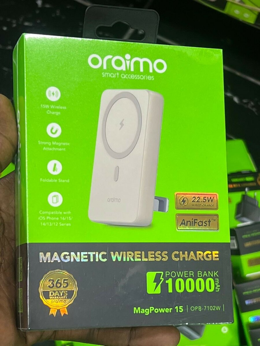 Découvrez le chargeur sans fil magnétique Oraimo, parfait pour une recharge rapide et sans effort. Avec sa capacité de 10000mAh et compatibilité avec les séries iPhone 12/13/14, il devient un compagnon indispensable. Profitez de sa technologie AniFast pour une puissance de 22.5W, idéale pour les déplacements.