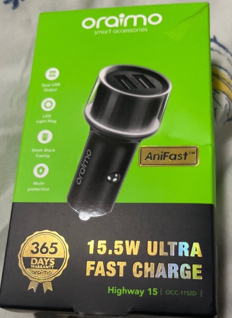 Chargeur de voiture Oraimo avec double ports USB, technologie AniFast™ pour une recharge ultra rapide de 15.5W. LED pratique et protection multiple. Idéal pour les trajets quotidiens.