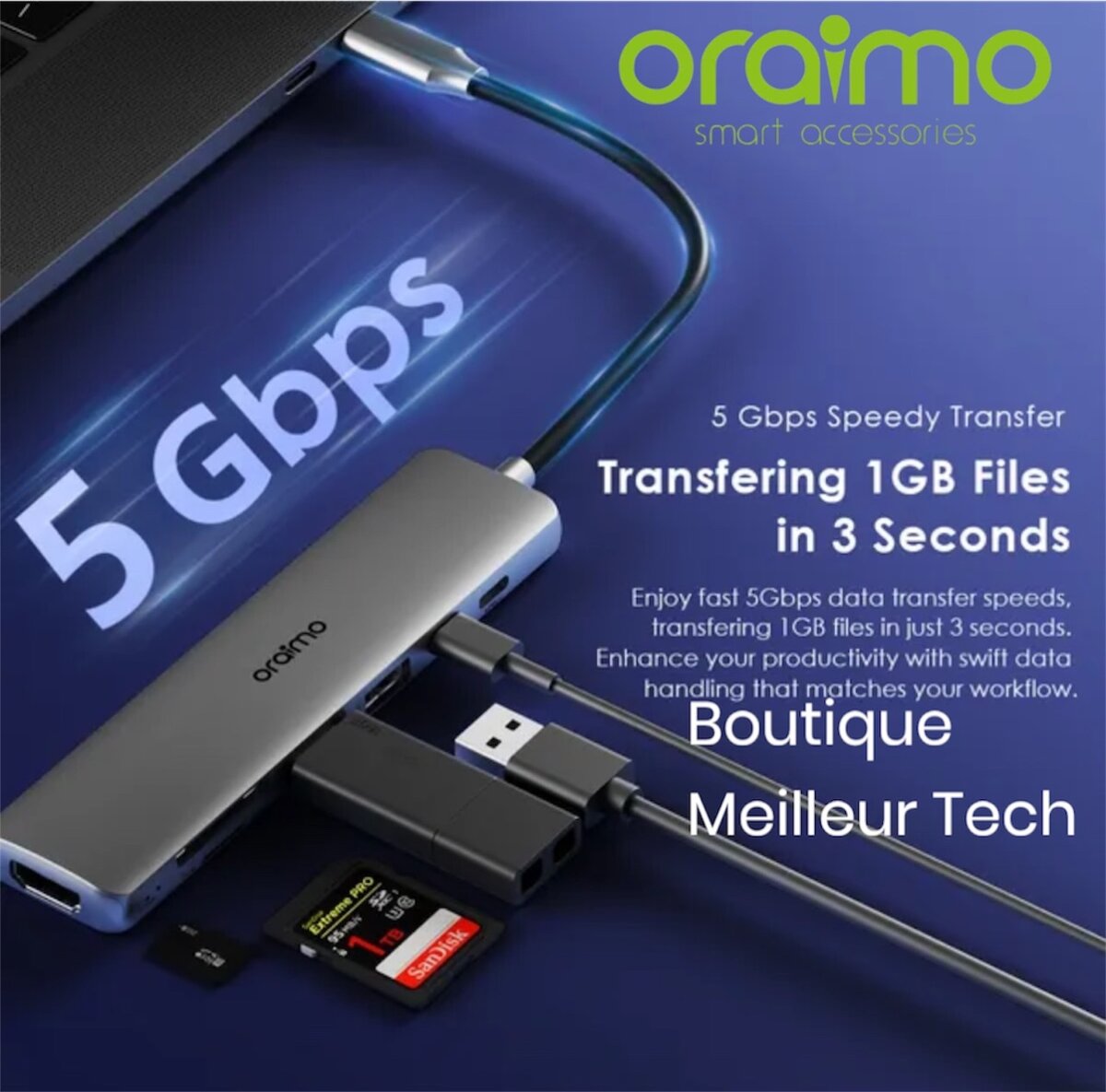 Transformez votre expérience numérique avec l'adaptateur Oraimo USB-C 7-en-1. Offrant une compatibilité multi-système, il facilite le transfert rapide des fichiers à 5Gbps, la recharge rapide PD 3.0 et un affichage vidéo 4K. Idéal pour les utilisateurs d'ordinateurs portables recherchant une connectivité optimale, sans pilote et dans un design élégant en alliage.