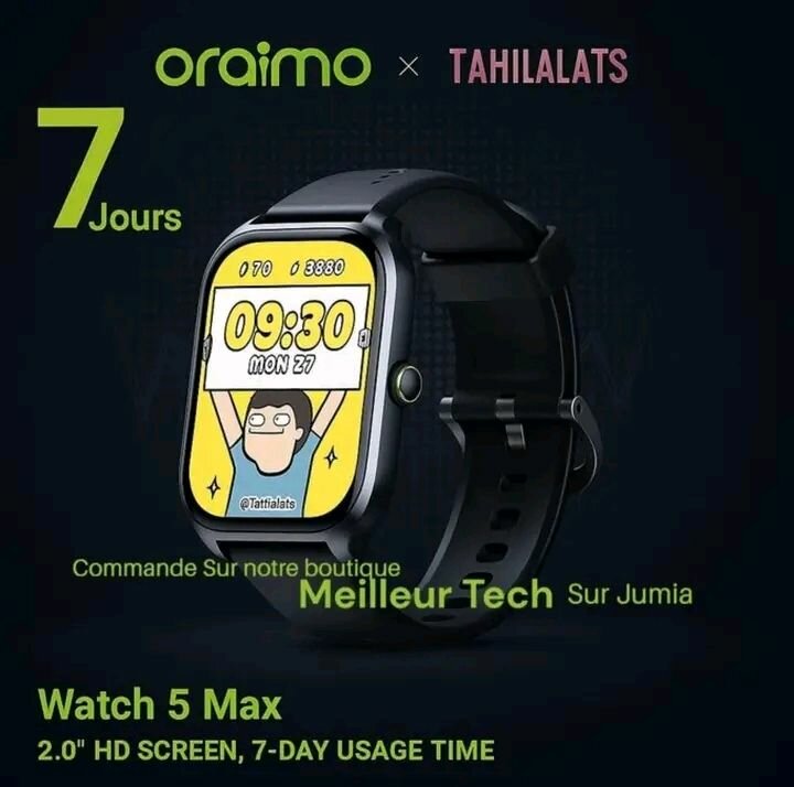 Découvrez l'Oraimo Watch 5 Max, votre partenaire technologique au quotidien. Profitez d'un écran HD 2", une autonomie de 7 jours, et des fonctions avancées de santé comme la surveillance de l'oxygène sanguin et du rythme cardiaque. Idéale pour rester connecté et en forme.