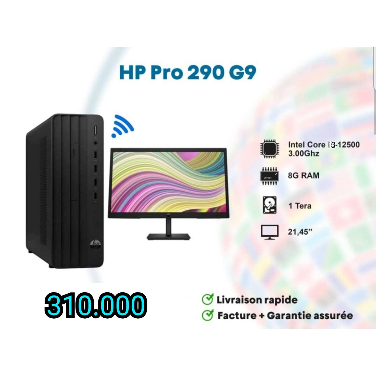 Découvrez l'ordinateur de bureau HP Pro 290 G9 avec processeur Intel Core i3-12500, 8 Go de RAM et 1 To de stockage. Inclut un écran 21,45 pouces. Parfait pour un usage quotidien avec livraison rapide et garantie.