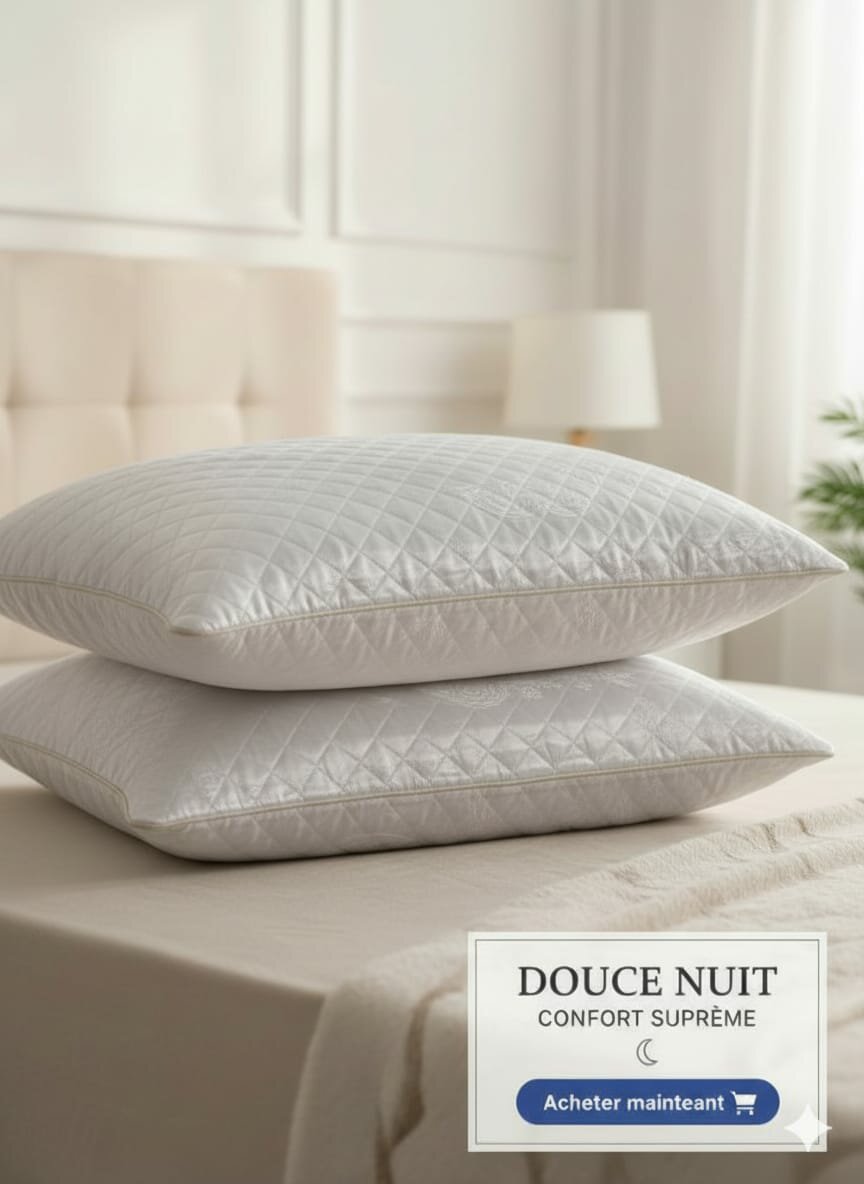 Découvrez le confort luxueux des oreillers Douce Nuit, parfaits pour des nuits reposantes. Leur design élégant s'intègre parfaitement à toute chambre.