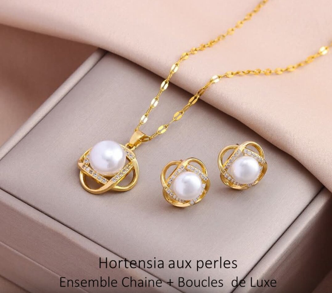 Élégant ensemble de bijoux doré avec perles, comprenant une chaîne et des boucles d'oreilles. Parfait pour un look sophistiqué et chic. Idéal pour les occasions spéciales ou comme cadeau précieux.