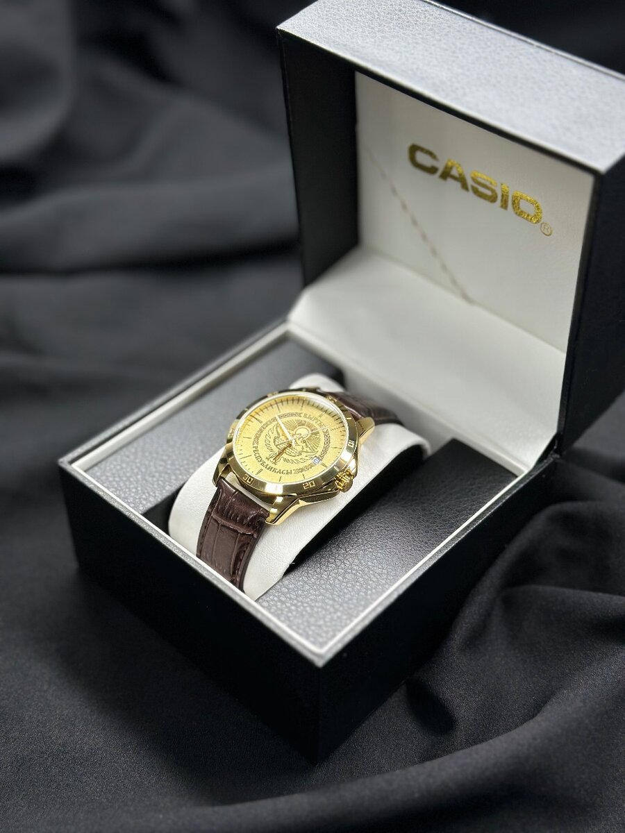 Оригинальные часы Casio с эксклюзивной лазерной гравировкой герба КР стильный аксессуар для тех, кто ценит качество и символику. Подарочный футляр в комплекте делает их идеальным подарком. Бесплатная доставка по всей стране!