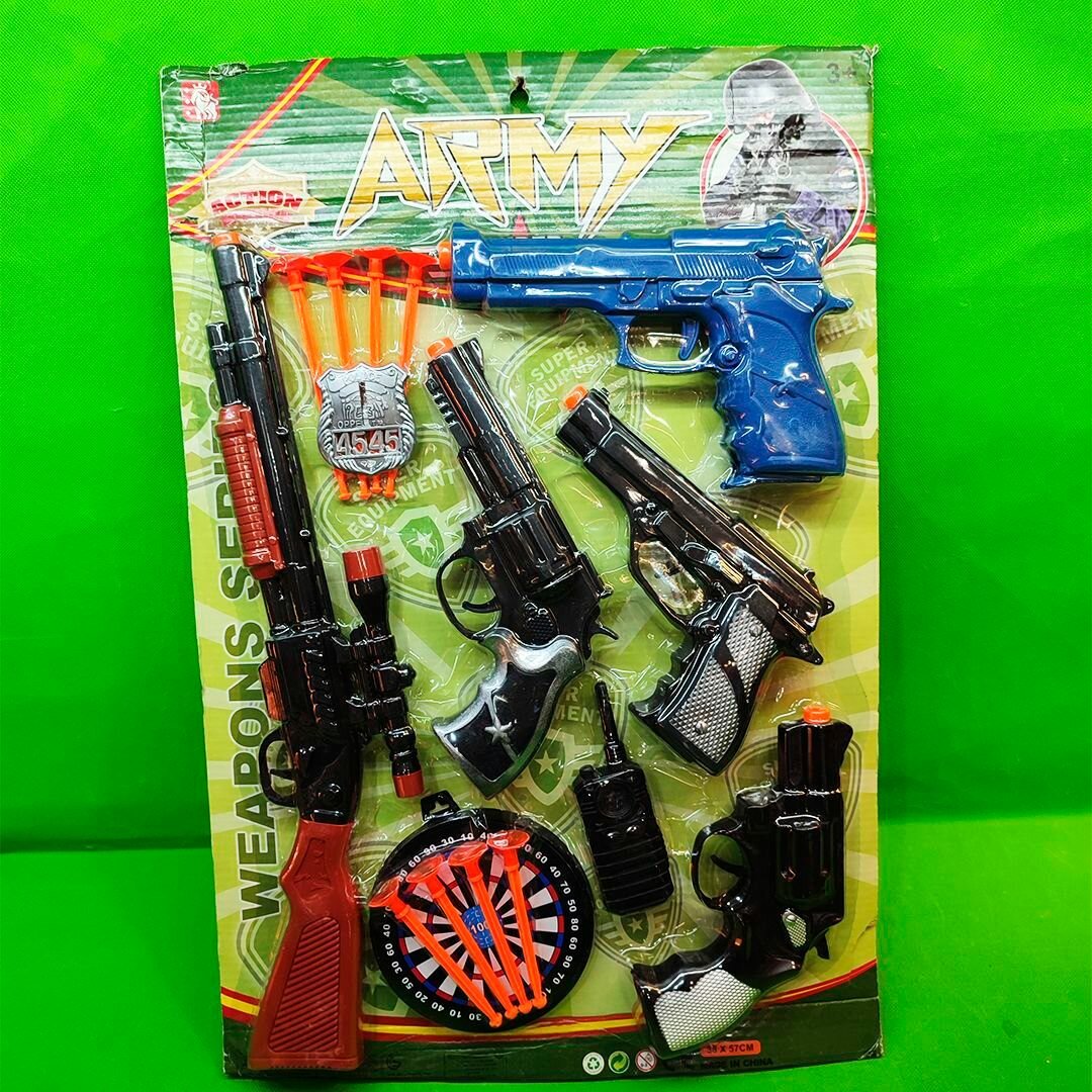 В комплекте есть дробовик, 4 разных пистолета, мишень, 4 больших и 4 маленьких дротика, жетон и рация