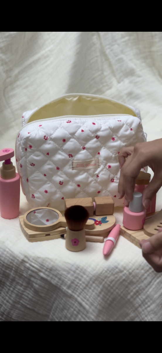 Wonders» - идеальный подарок для маленькой модницы! Все аксессуары выполнены из дерева, окрашены в нежные розово-бежевые оттенки и украшены цветочками. В комплекте: зеркальце, кисточка, флакончики, "губная помада", тени, лаки и многое другое - всё, как у мамы, только безопасно и с любовью.