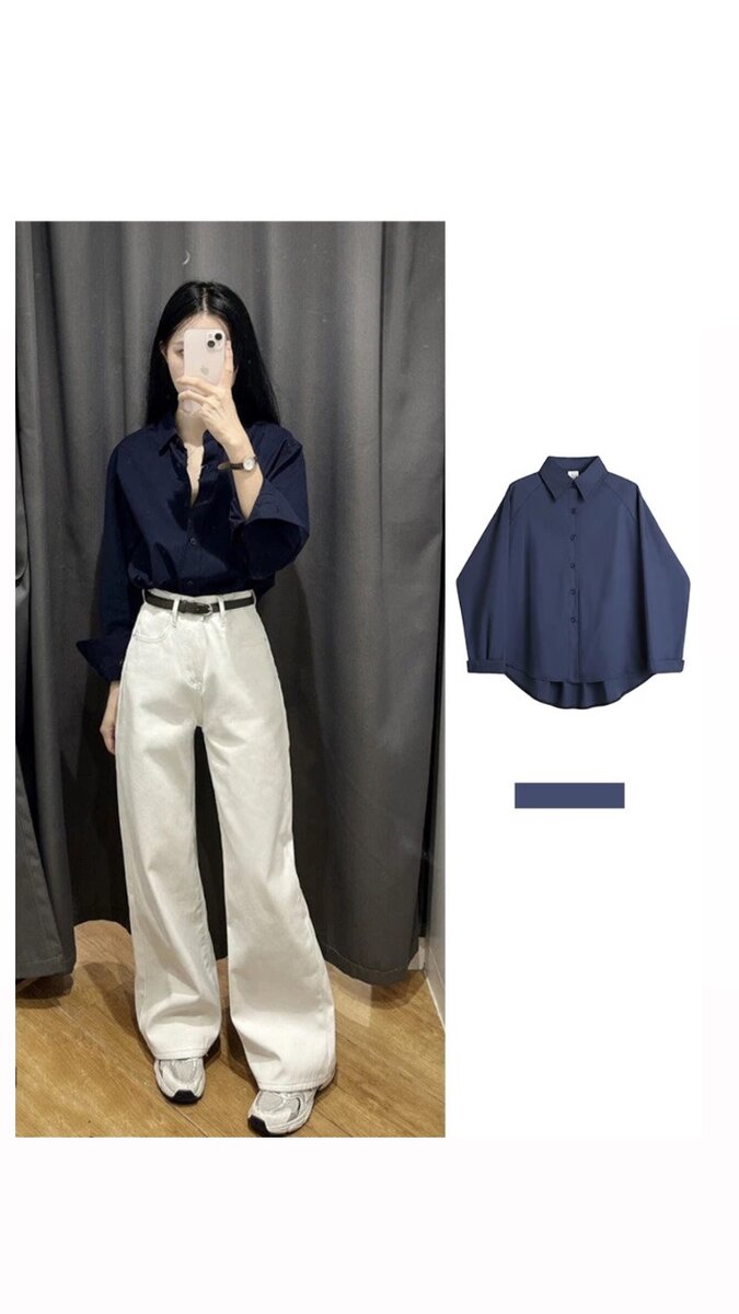 Идеальное сочетание: свободные белые джинсы + тёмно-синяя рубашка. Этот комплект про минимализм с характером. Джинсы подчёркивают фигуру, а рубашка добавляет интеллигентную небрежность. Универсальный лук на каждый день: в офис, на прогулку или встречу с подругами. Стиль, который не требует усилий.