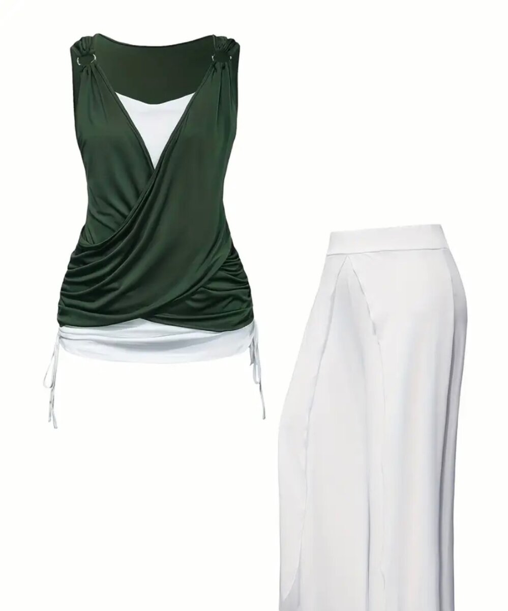 Двойка Комплект из двух предметов с рюшами и цветными блоками больших размеров, топ на бретельках по бокам и широкие брюки с разрезом Грудь 119-125см Талия 104-110см Бедра 129-135