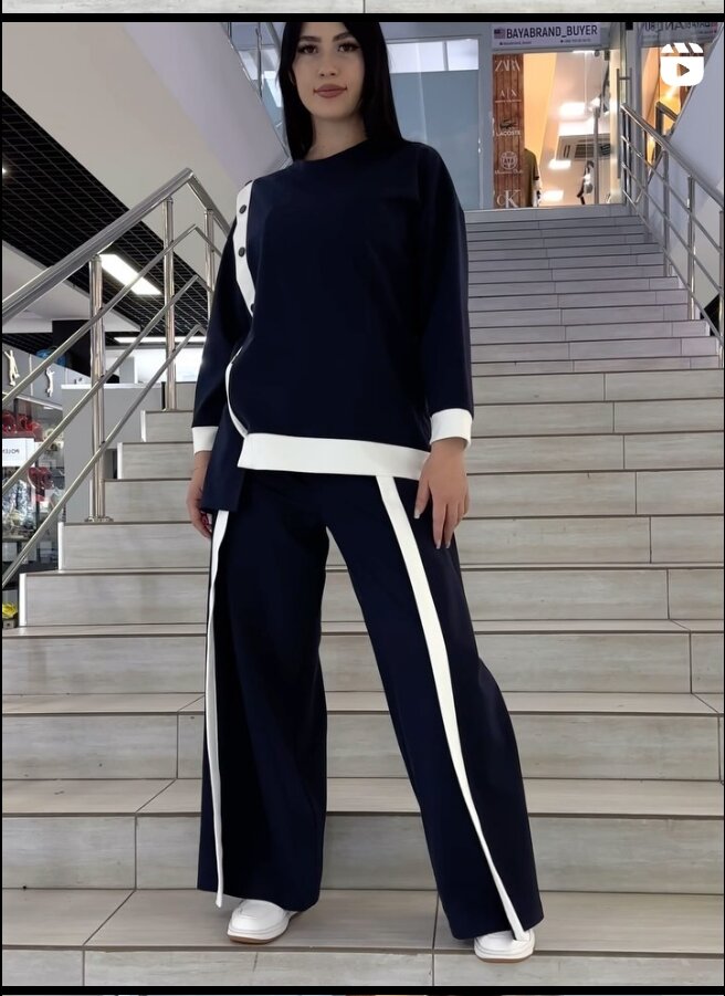 Темно-синий костюм с белыми контрастными вставками и декоративными кнопками сочетает в себе комфорт и элегантность.