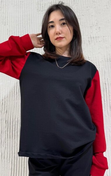 Свободные брюки с белой полосой по бокам и удлиненный топ придают образу легкости и современности.