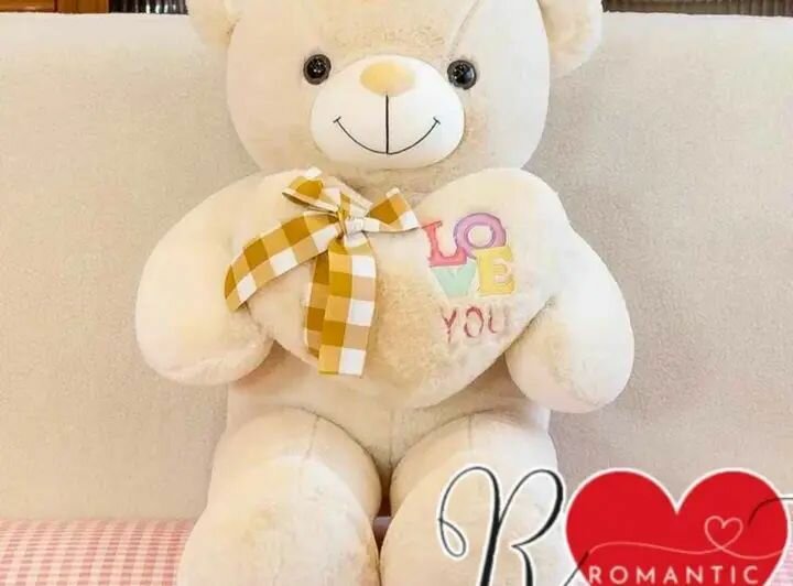 Un ours en peluche blanc doux et câlin avec un cœur décoratif portant l'inscription 'LOVE YOU'. Cadeau idéal pour la Saint-Valentin ou pour exprimer votre affection. Fabriqué en matériau doux et confortable.
