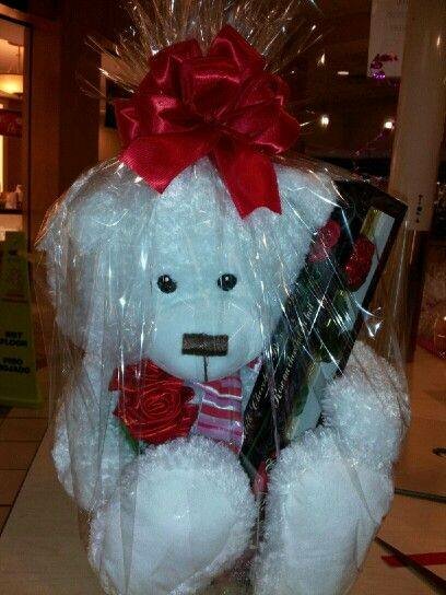 Un ours en peluche blanc doux et câlin, accompagné d'une rose rouge et d'une carte de voeux, emballé dans un joli papier transparent avec un ruban rouge. Un cadeau idéal pour la Saint-Valentin ou toute autre occasion spéciale.