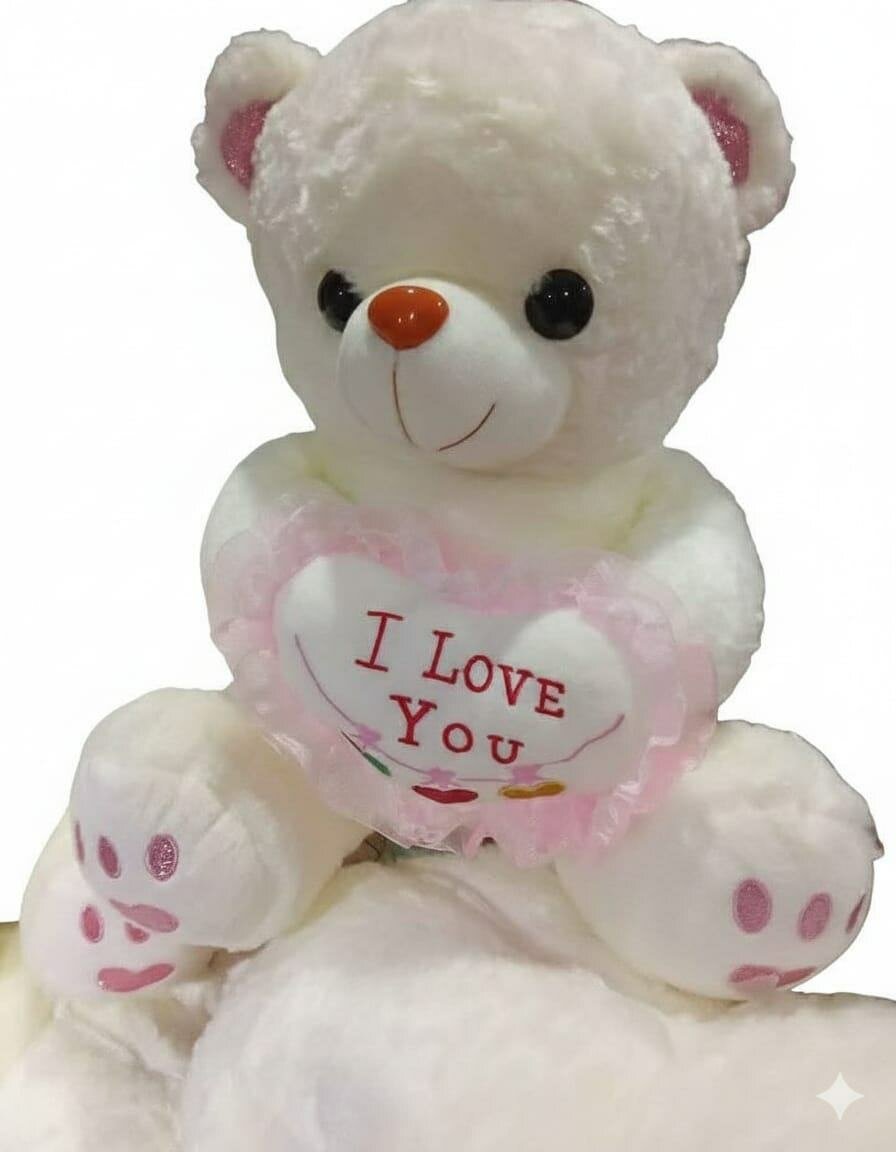 Un ours en peluche blanc doux et câlin avec un cœur 'I Love You'. Idéal pour la Saint-Valentin ou pour offrir à quelqu'un de spécial. Fabriqué en matériaux doux et sûrs.