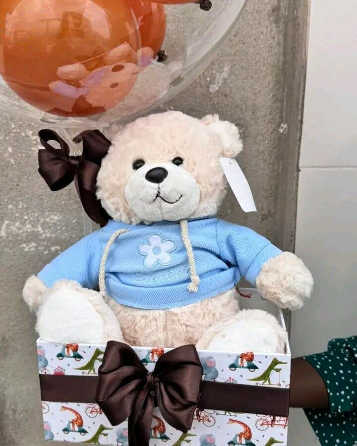 Un ours en peluche doux et affectueux, parfait pour les enfants et les adultes. Il est présenté dans une boîte cadeau avec un ballon.