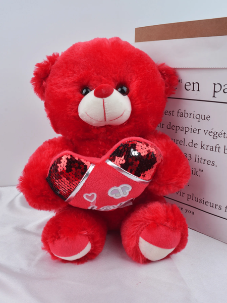 Un ours en peluche rouge avec un cœur 'I love you'. Livré avec une tasse et des stylos. Cadeau idéal pour la Saint-Valentin ou pour exprimer votre amour.