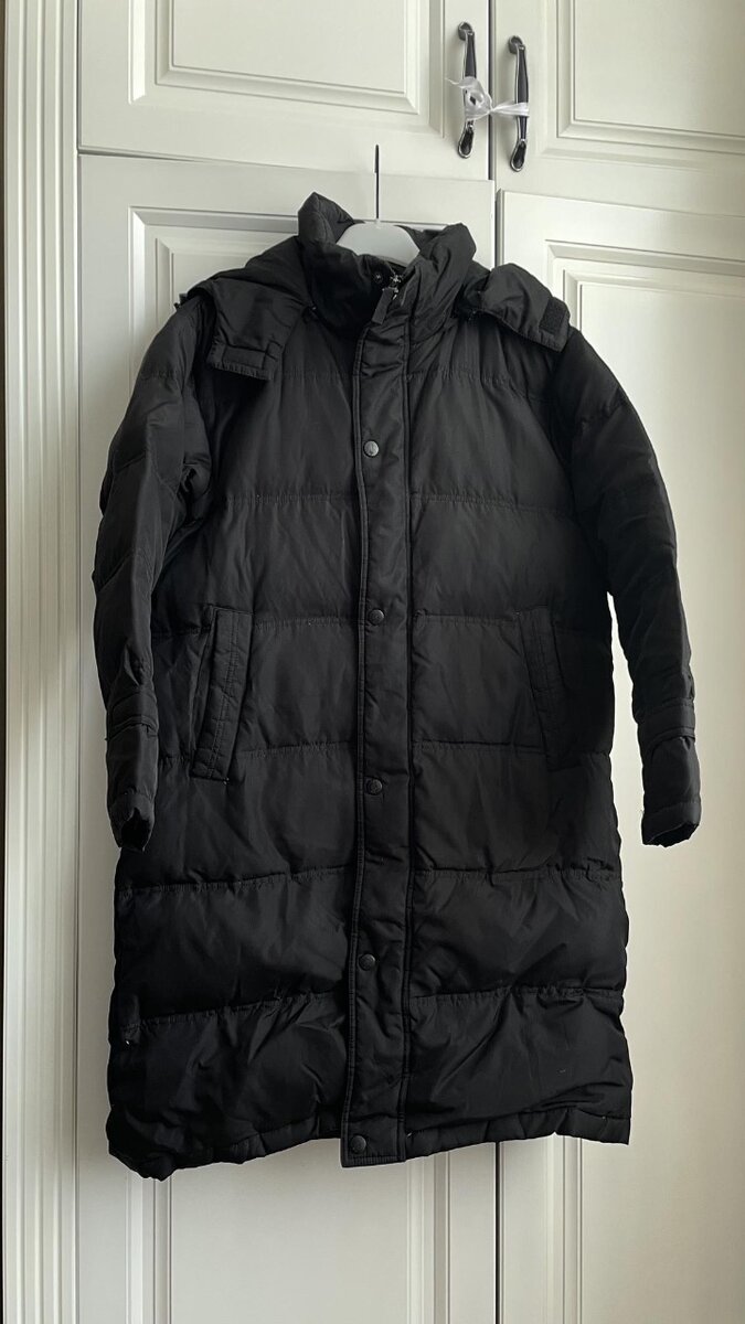Цвет: черный Длинный Размер M/L Рост: до 186 В хорошем качестве Только дырка в кармане