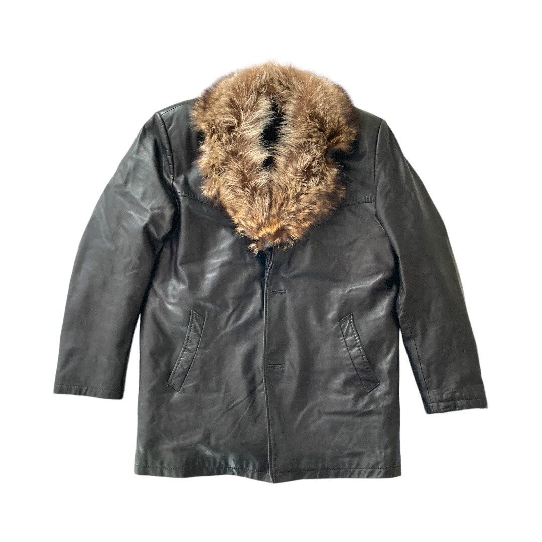 Классическая мужская куртка из кожи высокого качества с воротником из меха енота, с отстегивающимся подкладом из плотного слоя шерсти в хорошем состоянии 48 разм. Турция.