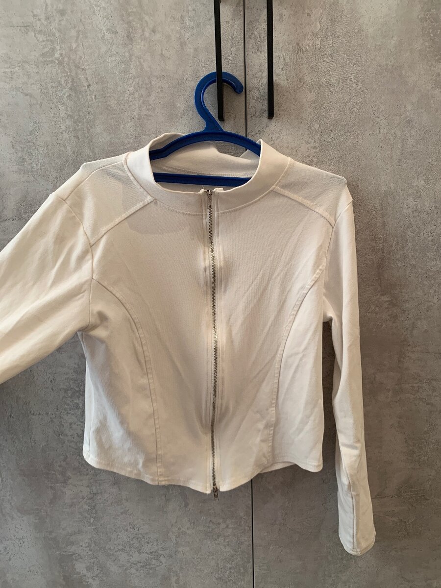 Белая кофта на молнии, выполненная из мягкой ткани. Имеет простой, минималистичный дизайн с аккуратными швами и круглым вырезом. Универсальная модель, подходит для повседневной носки.