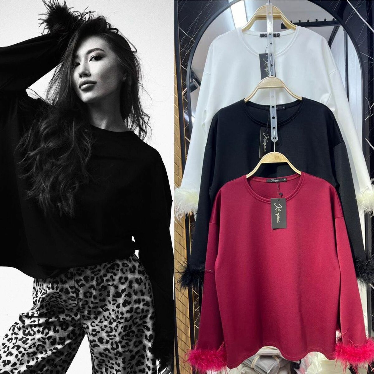 Хит продаж из трикотажа Элегантные блузки с изысканной отделкой из натуральных перьев,создают невероятно стильный образ Размер :SSMM Цвета:айвори,черный,бардо Ткань: дорогой трикотаж Качество 10/10000