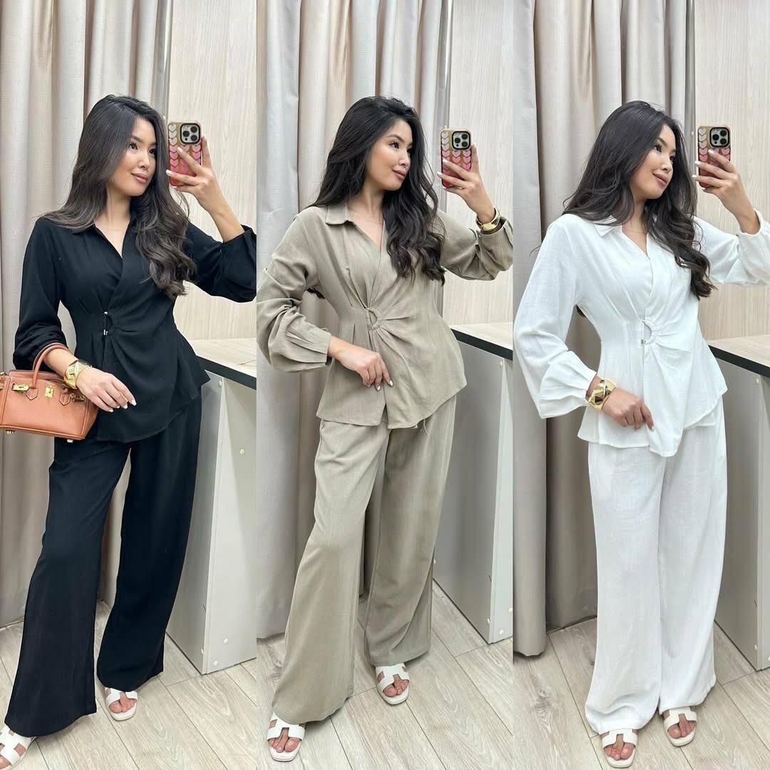 Асимметриялуу көйнөк жана галстук менен ак түстөгү аялдардын шым костюму