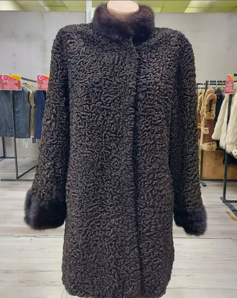 Шуба из натурального каракуля воротник и манжеты норка