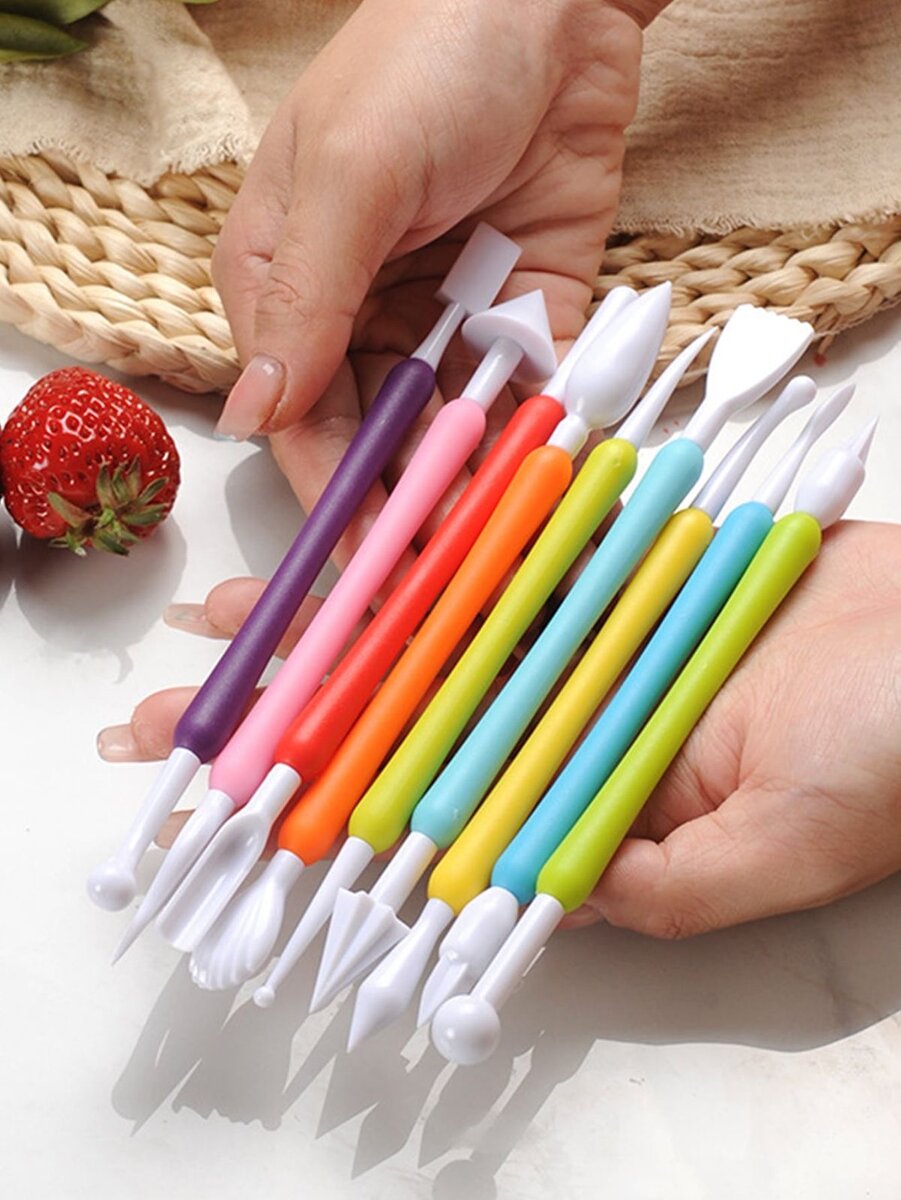 Ensemble de 10 outils de modelage pour pâtisserie, parfaits pour créer des décorations en pâte à sucre. Variété de formes et couleurs vives pour stimuler la créativité.