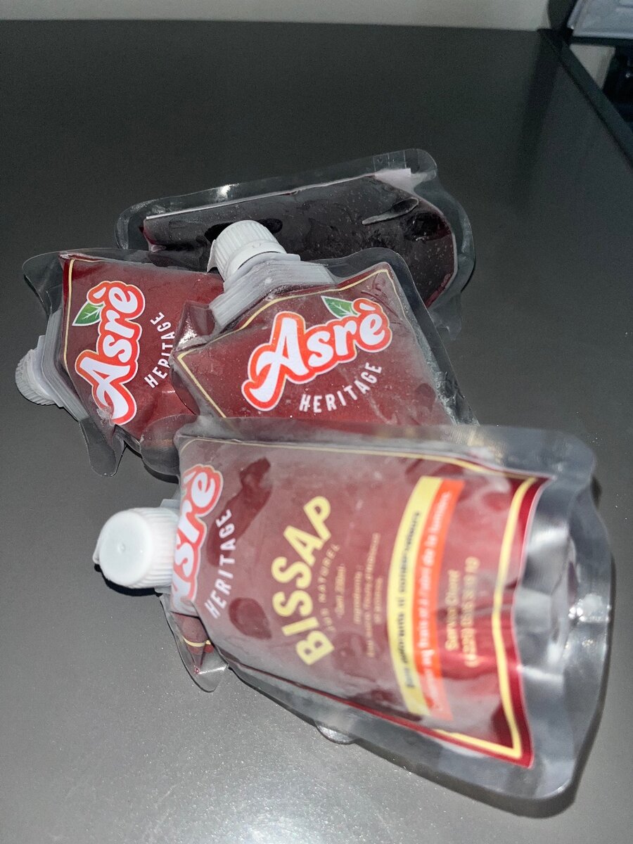 Découvrez le goût rafraîchissant d'Asrè Heritage Bissap. Le pack de 1000frs. 5 Bissap de 200ml