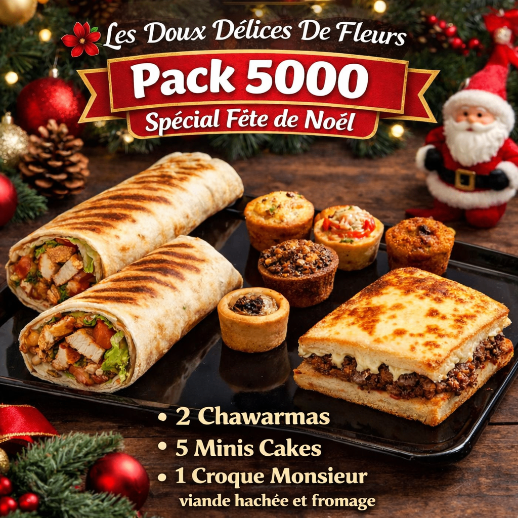 Découvrez notre Pack 5000 spécial fête de Noël avec 2 délicieux chawarmas, 5 mini cakes savoureux et un croque monsieur gourmand à la viande hachée et fromage. Parfait pour célébrer avec goût et raffinement !