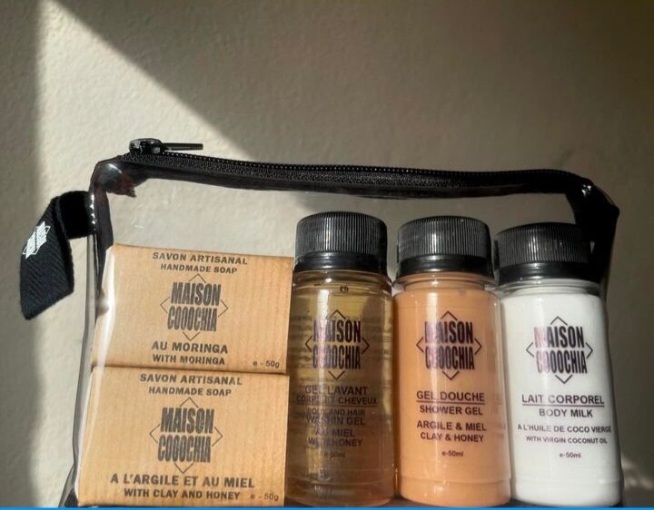 1 gel douche argile miel 50ml - 1 gel lavant miel 50ml - 1 lait corporel huile de coco vierge 50ml - 1 savon moringa 50grs - 1 savon argile et miel 50grs
