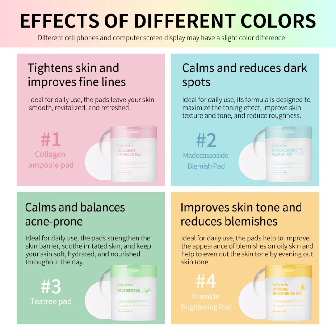 Découvrez les pads de luminosité Lakrain, parfaits pour unifier le teint et réduire les imperfections. Avec des ingrédients naturels et puissants, ces pads revitalisent et rafraîchissent votre peau au quotidien. 80 pads par boîte.