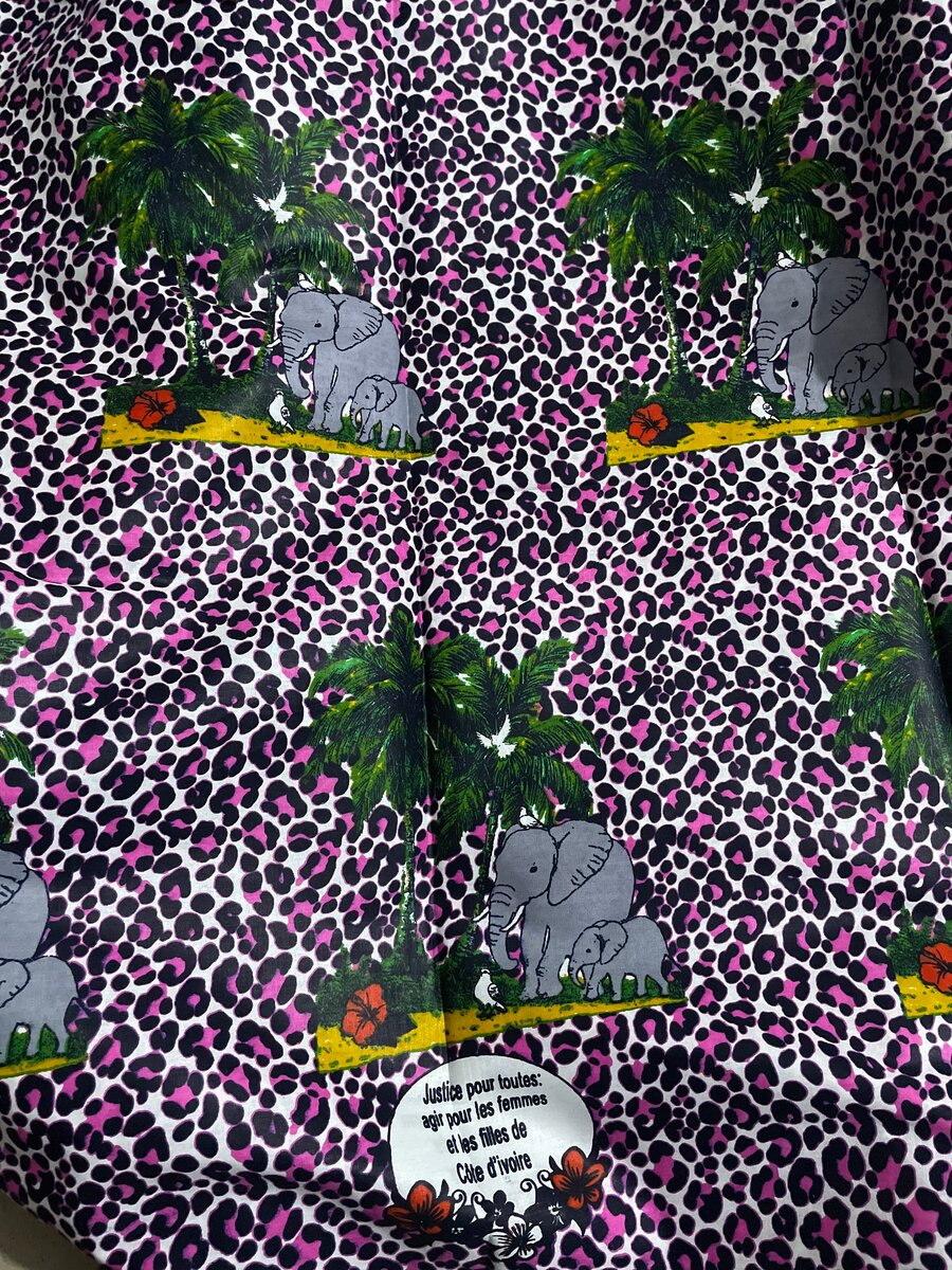 Découvrez ce magnifique tissu 8 mars avec motifs d'éléphants et palmiers, idéal pour des créations africaines authentiques. Parfait pour couture de vêtements et accessoires ethniques.
