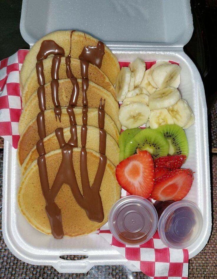 Dégustez ces pancakes moelleux garnis de chocolat fondant accompagnés d'une sélection de fruits frais : bananes, kiwis et fraises. Parfait pour un petit-déjeuner gourmand ou un brunch plein de saveurs. Ajoutez les sirops à votre goût pour une explosion de douceur.