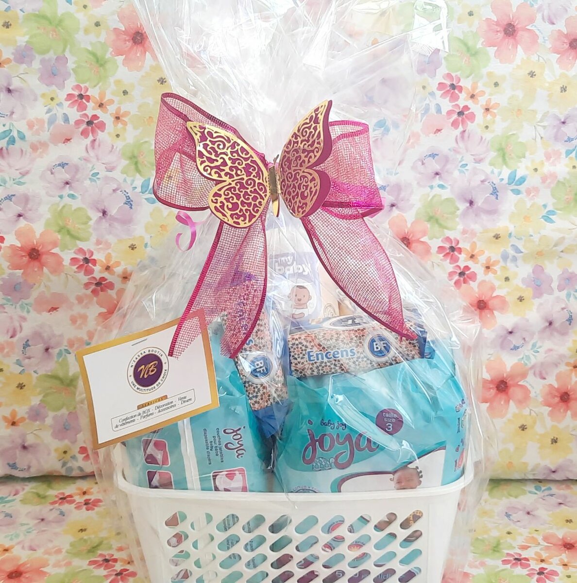 Un merveilleux panier cadeau pour bébé comprenant des couches, des lingettes et des morceaux de savon parfaitement présenté avec un joli ruban. Idéal pour les nouveaux parents en quête du cadeau parfait pour une naissance.