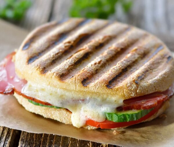 Panini saucisse jambon viande hachée plus oeuf fromage tout dans un même pain.