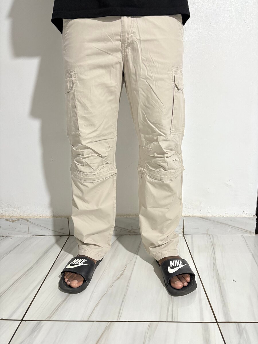 Pantalon cargo en coton beige, confortable et pratique avec poches multiples. Idéal pour un look décontracté ou des aventures en plein air. Fabriqué pour offrir liberté de mouvement et style moderne.