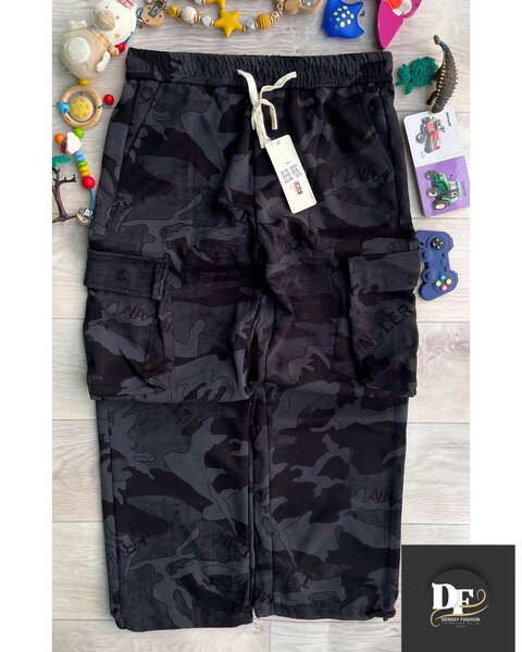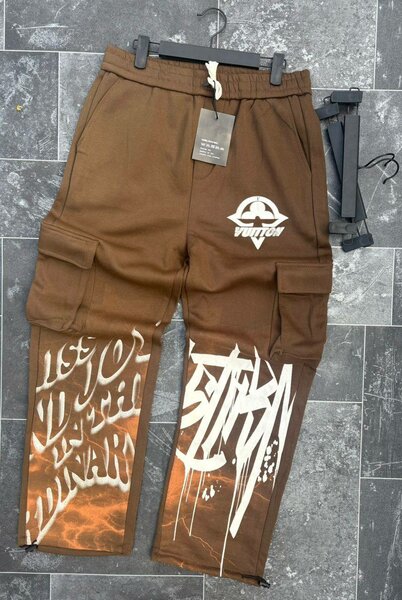Pantalon cargo noir avec impression audacieuse "Desire". Poches latérales pratiques, parfait pour un style urbain moderne. Confortable et tendance, idéal pour un look décontracté.