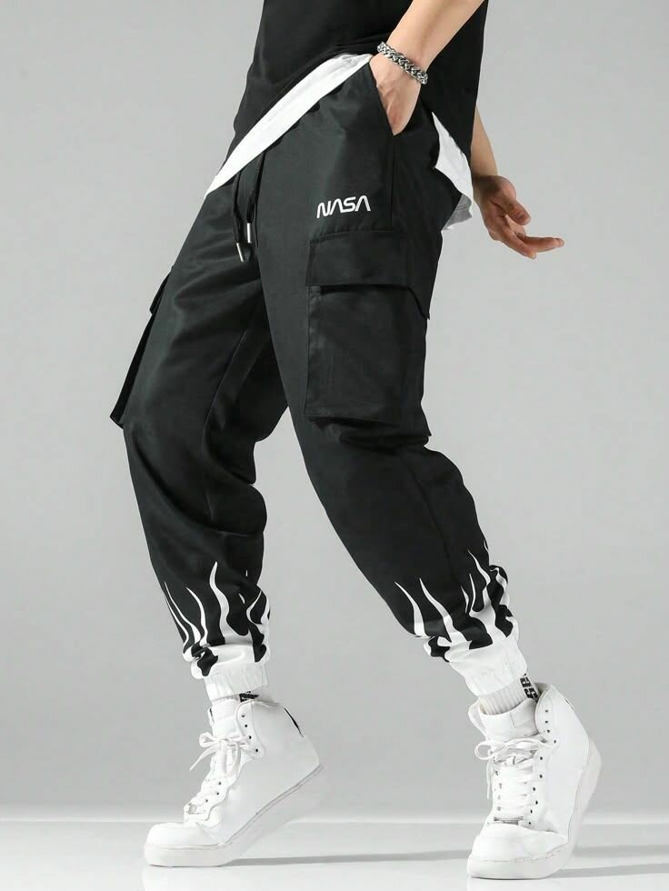 Pantalon cargo noir avec imprimé flammes et logo NASA. Conçu pour un style urbain et décontracté. Matière résistante et confortable.