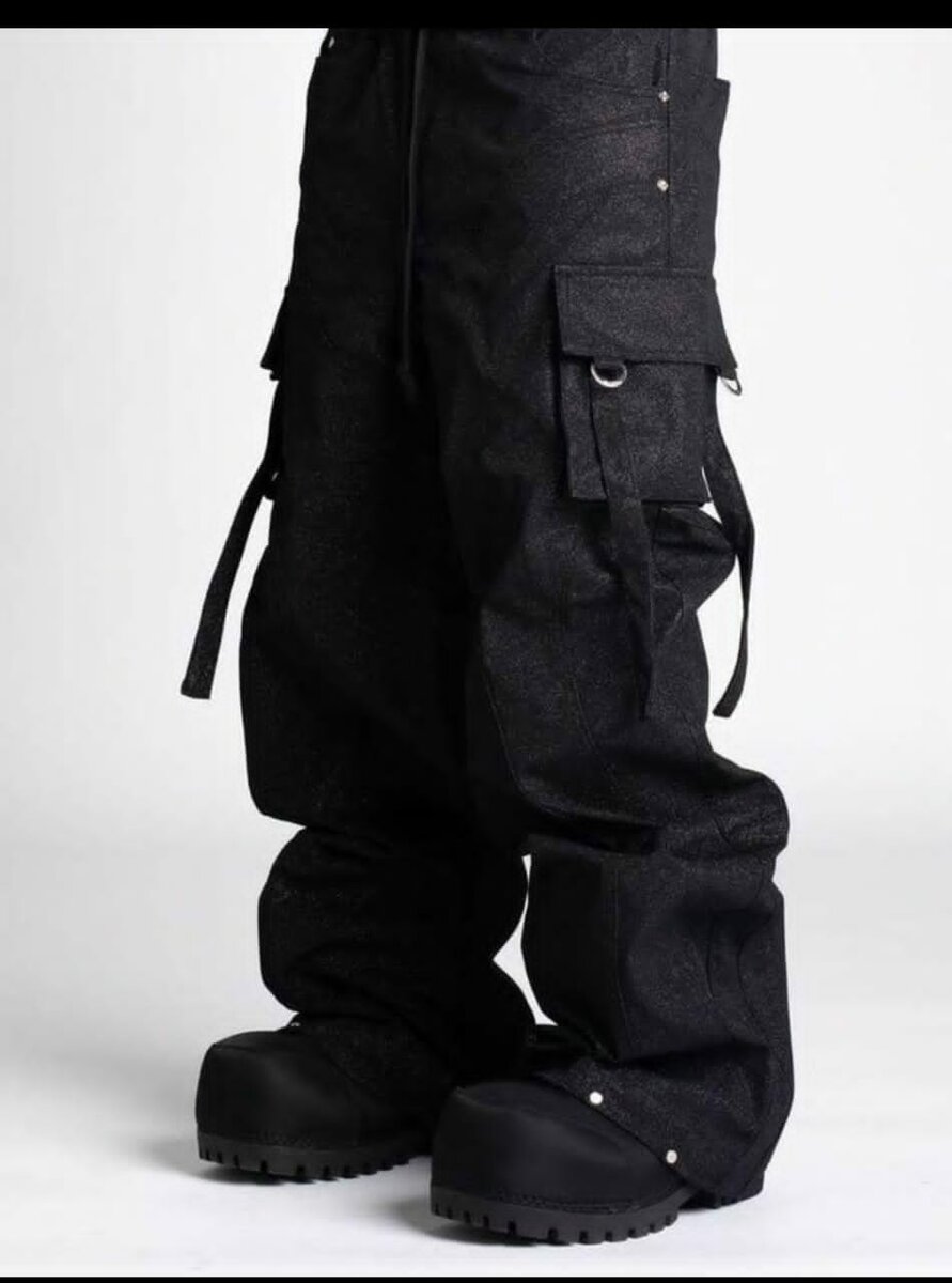 Pantalon cargo noir en tissu résistant avec poches latérales pratiques, idéal pour une allure urbaine moderne. Parfait pour un look streetwear audacieux.